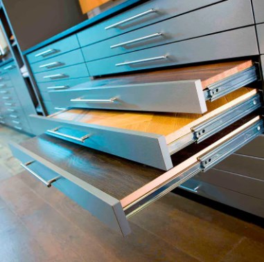 Slide laci menentukan apakah laci terbuka dan tutup dengan lancar dan pelan. Slide berkualitas tinggi biasanya menampilkan desain tiga bagian, memungkinkan laci untuk sepenuhnya memperpanjang akses mudah. Mereka biasanya dibangun dari baja linting dingin dengan permukaan yang dilapisi atau dilapisi semprotan untuk resistansi korosi yang ditingkatkan. Slide dengan fungsi redaman atau rebound juga populer. Slide redaman memungkinkan laci untuk ditutup dengan lembut, mencegah jepit; Slide rebound secara otomatis muncul dengan tekan lampu pada panel laci, menghilangkan kebutuhan untuk pemasangan pegangan dan meningkatkan penampilan bersih kabinet.